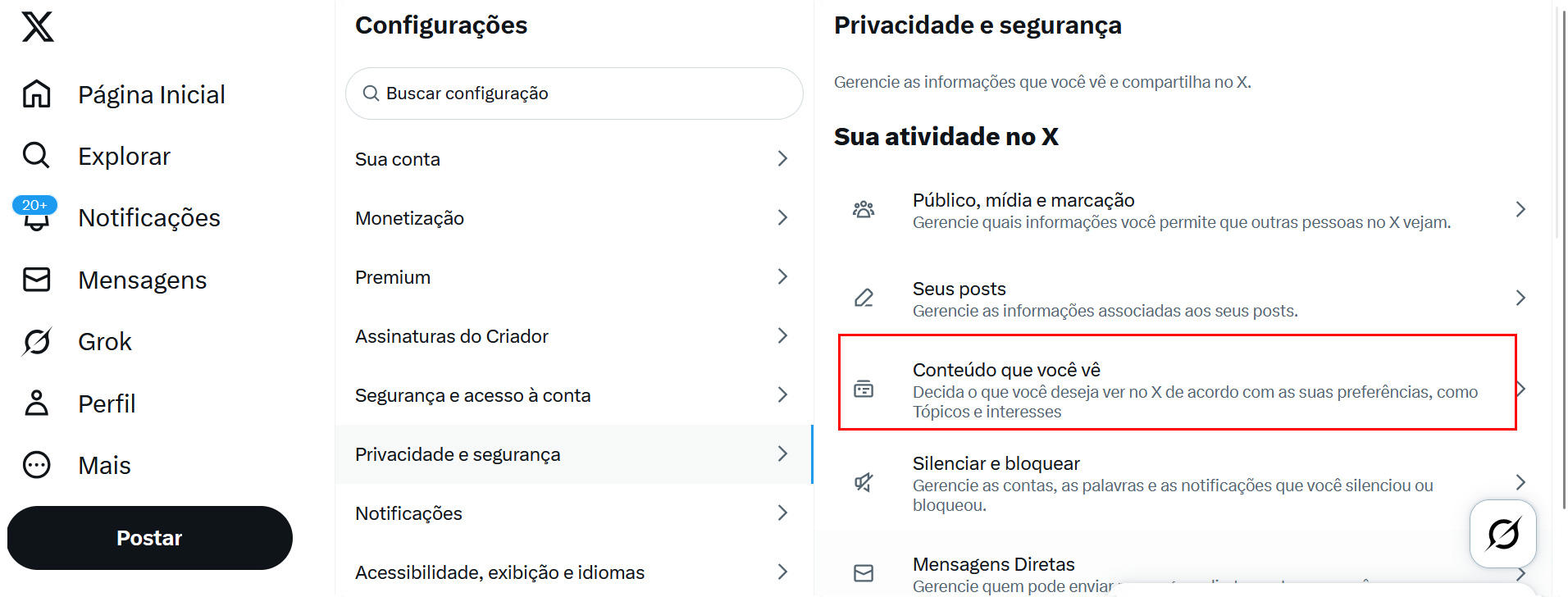 - Dentro de Privacidade e Segurança → Conteúdo que você vê.
